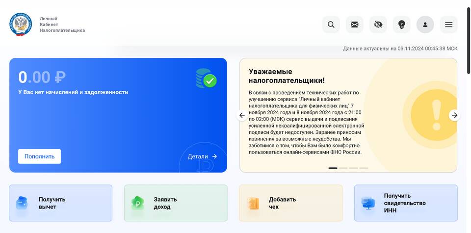 Личный кабинет налогоплательщика | Все виды налогов, задолженности, переплаты | В реальном времени |