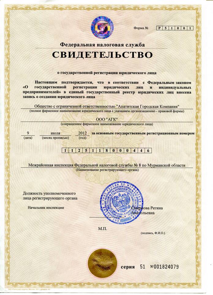 - Название документа: "Свидетельство о внесении записи в ЕГРЮЛ"